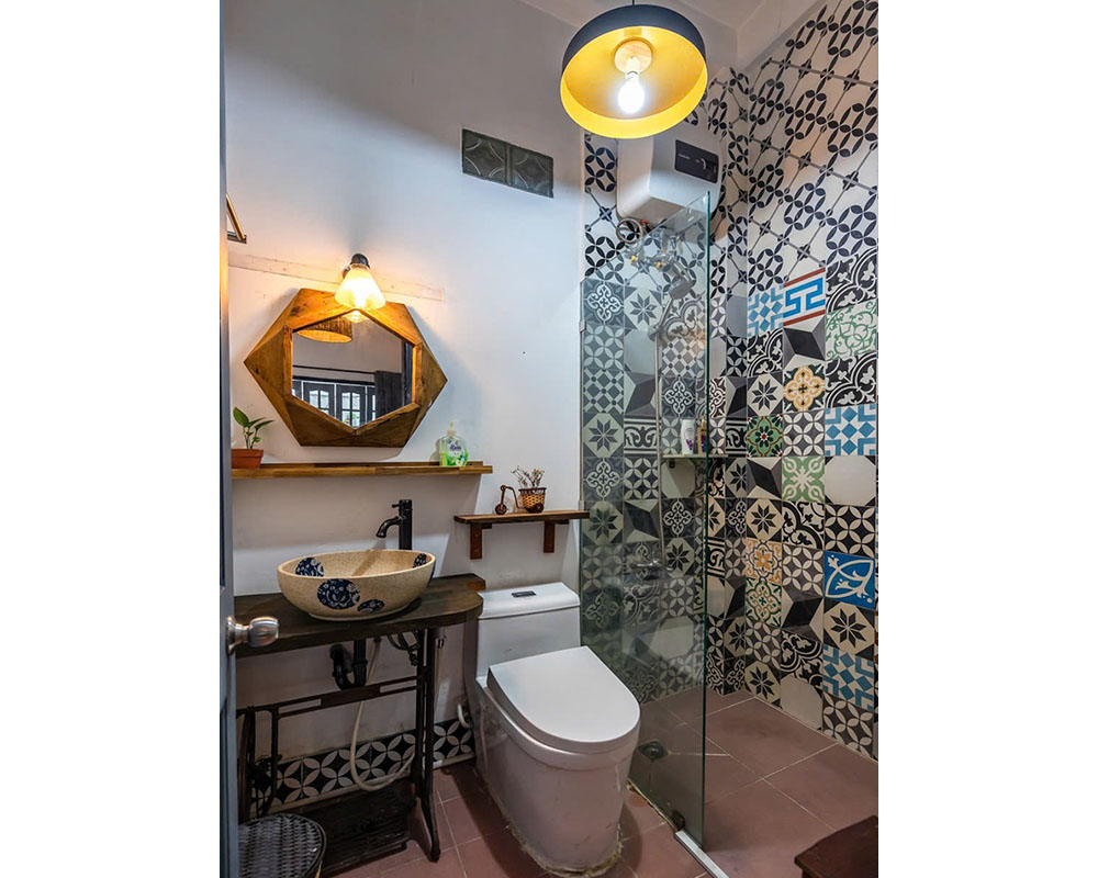This serviced apartment has a vintage style with wooden furnishings that create a cozy atmosphere. The living area comes with a soft sofa and coffee table, a cozy spot to relax after a hard day. The kitchen and dining area with patterned tiles and plenty of natural light from the backyard bring an open feel. The kitchen cabinet is set up beside the dining table, providing a good corner to share meals with your friends and family. The bedroom includes a comfortable bed, a wardrobe, and a desk, practical for both rest and work. With 2 large windows, the bedroom is always bright and airy throughout the day.